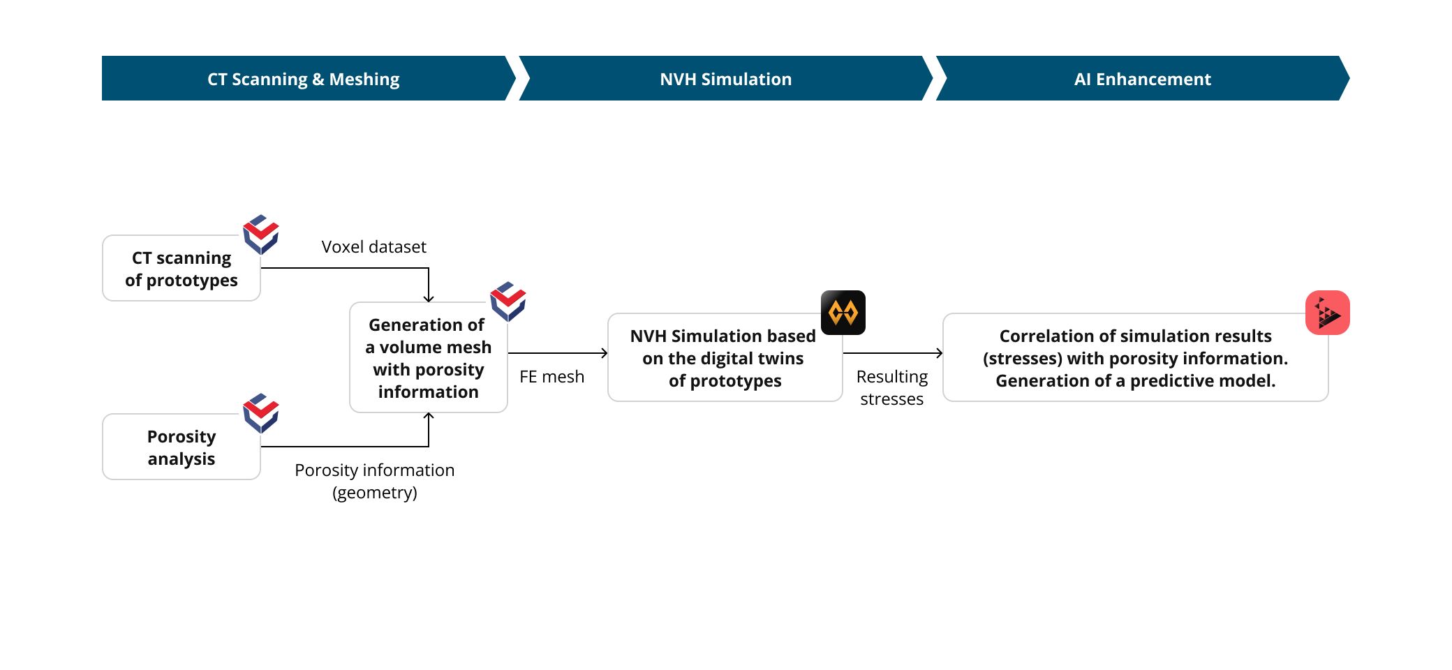 In early project phases, new part designs are tested virtually. Virtual testing is mostly performed on CAD models, perfect in geometry and material. Safety factors are applied to the results to make sure parts will last in real use cases, even if they may have minor geometry deviations and material imperfections such as porosity. Those safety factors often lead to overspecified designs, resulting in unnecessarily high procurement and manufacturing cost.